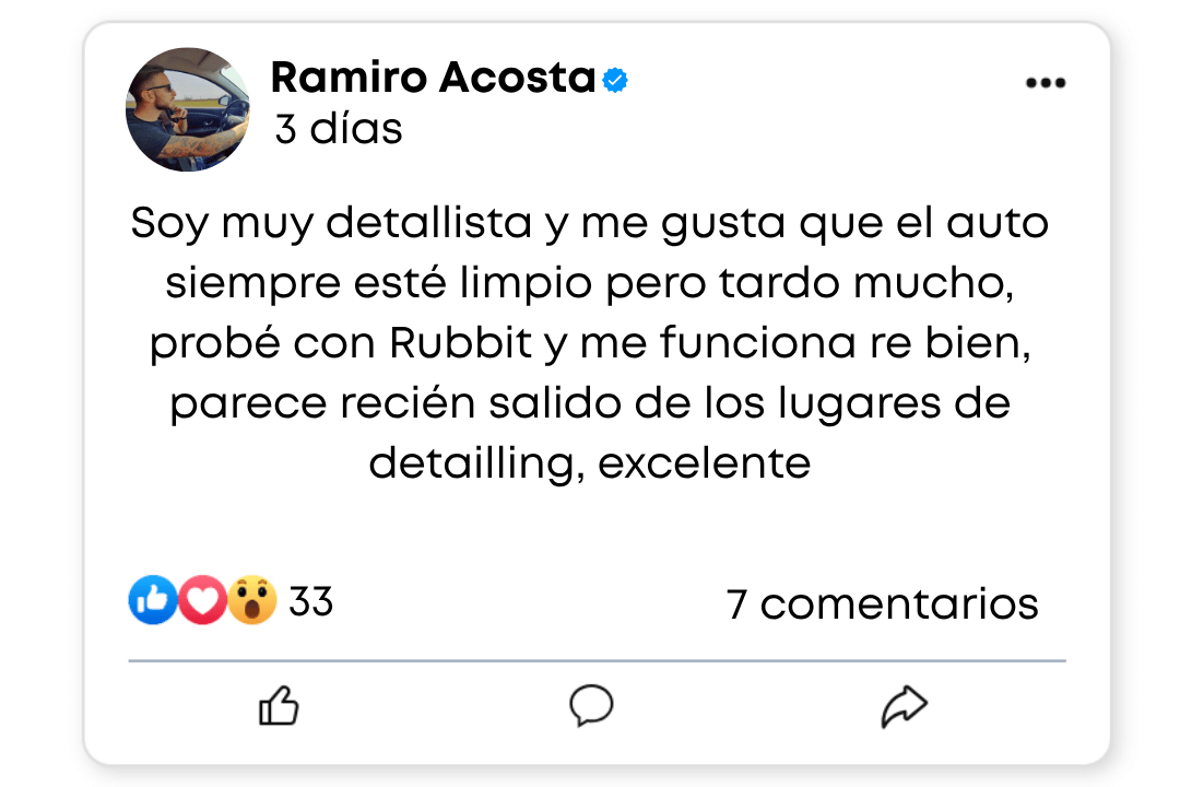 Ya sea que manejes un auto de uso diario o un clásico guardado en garage, podés confiar en Rubbit para limpiar de forma segura, proteger la pintura y mantener tu vehículo impecable.